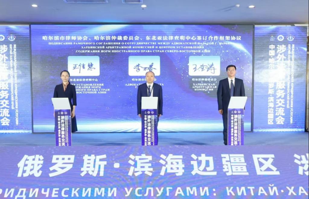在发布与签约仪式上,东北亚法律查明中心与哈尔滨律师协会、哈尔滨仲裁委员会签订合作框架协议,三方将共建“赋能涉外法律服务质量提升联动平台”,推动法律查明、仲裁服务与律师协作的深度融合,为中俄企业提供更加全面、高效的法律保障。