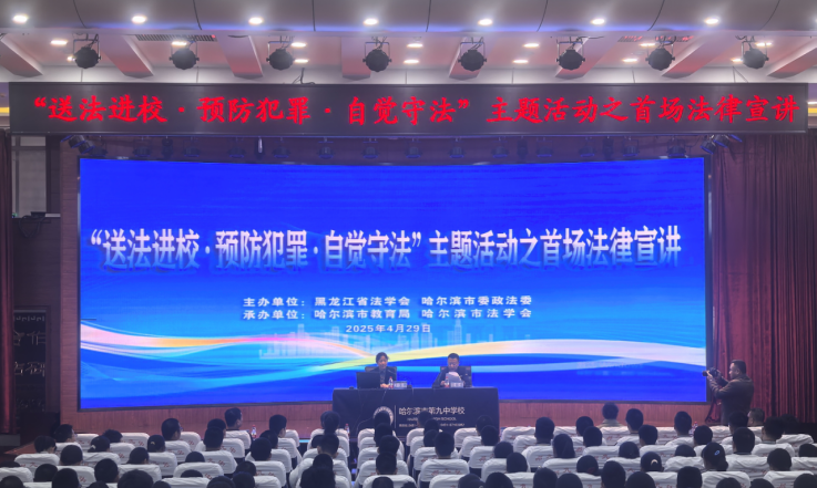 4月29日下午,由黑龙江省法学会、哈尔滨市委政法委主办,哈尔滨市法学会、哈尔滨市教育局承办的“送法进校·预防犯罪·自觉守法”送法进校活动在市第九中学正式启动。炸金花app下载