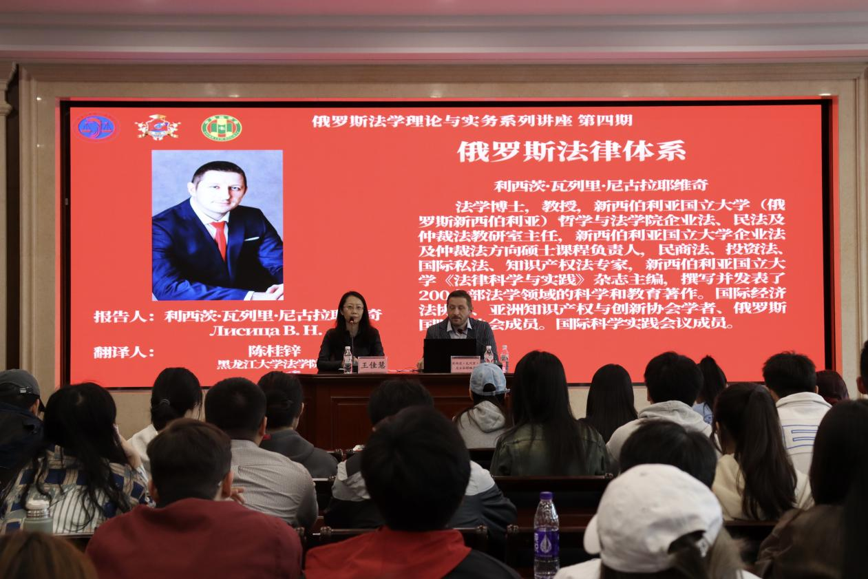 陈桂锌老师担任翻译。讲座采取线上线下结合的方式。黑龙江大学法律硕士(国际仲裁)研究生、法学研究生、“俄语+法学”实验班本科生等在现场参加讲座。