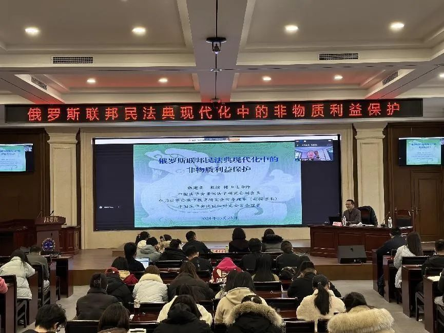 、中国法律文化与法治发展研究中心杨昌宇教授作为评议人。讲座题目为“俄罗斯民法典现代中的非物质利益保护”,张建文教授以俄罗斯民法典现代化中的非物质利益保护为主题,进行了精彩的讲座,并由杨昌宇教授精彩评议。张建文教授从历史维度出发,系统梳理了俄罗斯民法典对非物质利益保护的发展历程,探讨了俄罗斯联邦民法典在非物质利益保护方面的调整方法变化,以及俄罗斯联邦民法典中使用非物质利益合同的范围的扩大,俄罗斯联邦民法典对非物质利益保护方式的创新。杨昌宇教授从持续性发展、制度创新、价值定位等维度评议了俄罗斯非物质利益保护的立法创新,高度评价了张建文教授的研究成果,并对黑龙江大学俄罗斯法学研究发展给予了深切期待。