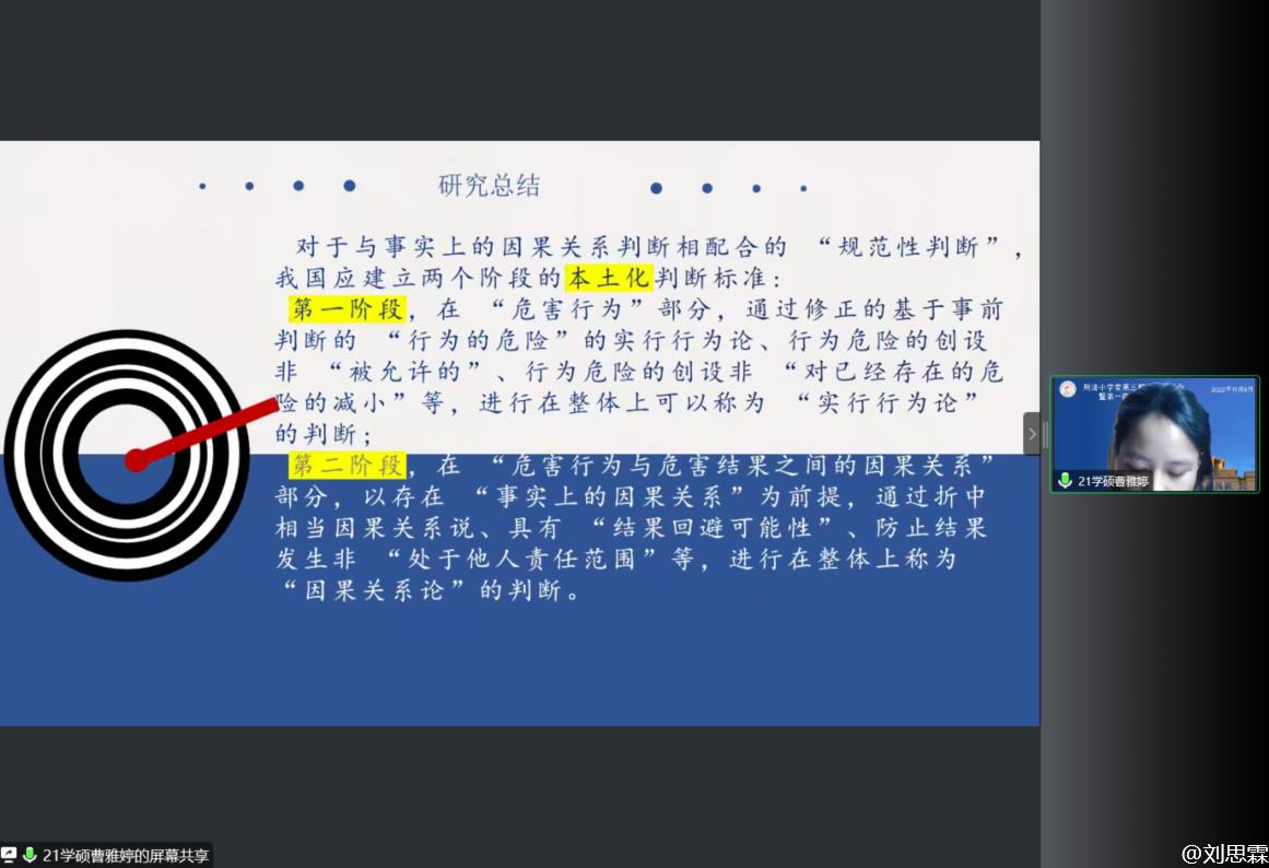 2021级刑法学硕士马敏针对陈兴良老师于2009年发表的《刑法因果关系:从哲学回归刑法学——一个学说史的考察》作分享交流。她认为本篇论文在一定程度上可以说是因果关系发展的学术史,文章以五十年代苏俄因果关系理论的争论为切入点,对我国早期的因果关系的研究进行了考察。虽然年代有些久远,但内容并不过时,陈老师从历史学的角度对因果关系的理论进行研究,对我们理解因果关系的发展具有重要作用。