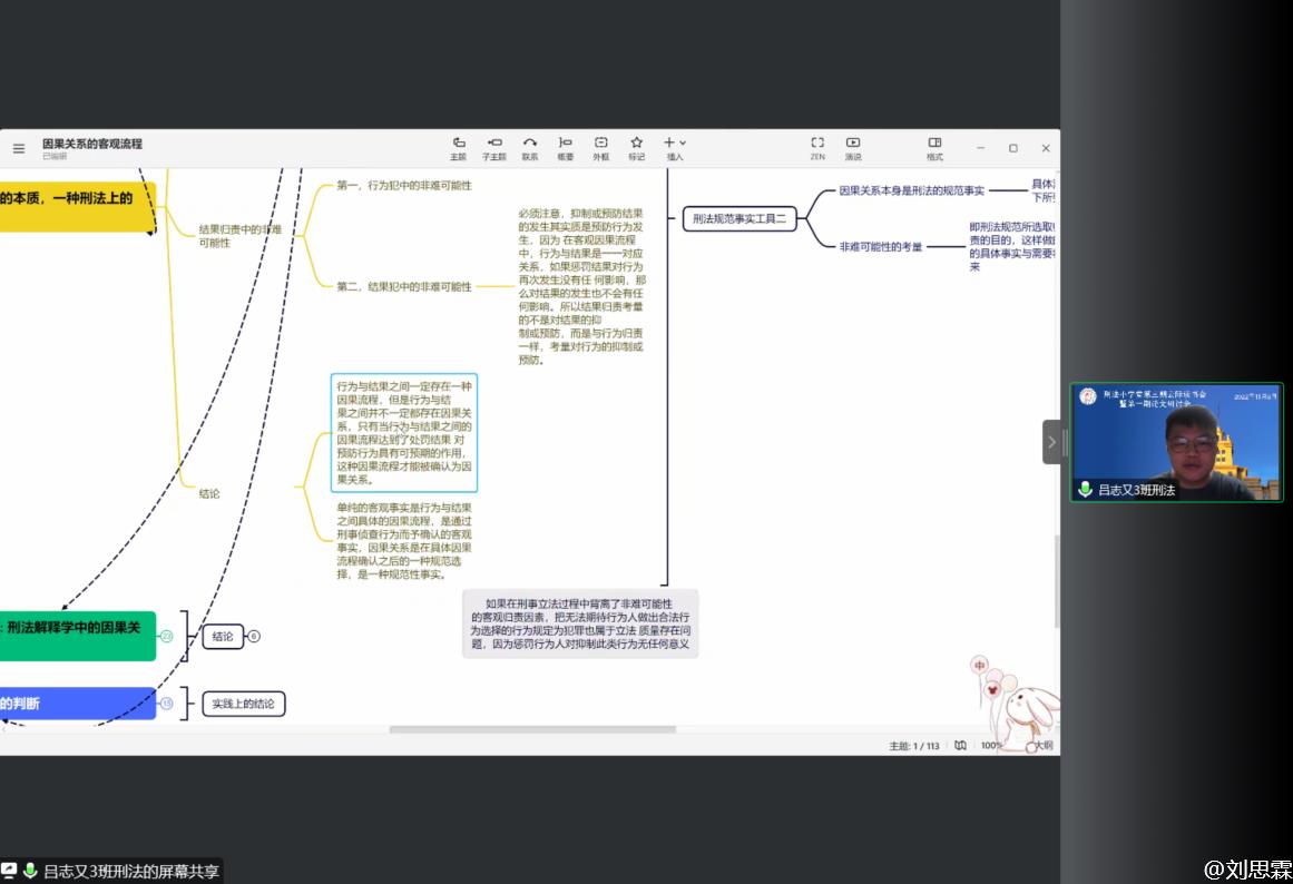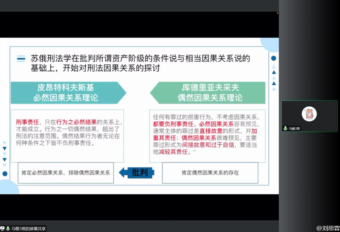 2021级刑法学硕士吕志又作为第二组的报告人就董玉庭教授的《从客观因果流程到刑法因果关系》一文做分享。以思维导图的形式,清晰的展现了文章的脉络和主要概念,阐述了董老师文章中客观因果流程的判断方式,并需要证据证明到事实清楚,从而形成条件关系,然后进行风险判断,这种风险判断是刑法上的风险判断,即需要达到刑法上风险程度,从而形成了刑法上的因果关系。