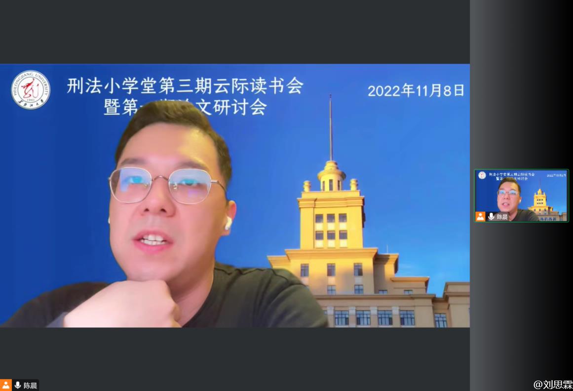 陈晨老师分别点评了同学们的汇报后,对参与本次读书会的老师们和同学们致以感谢,鼓励同学们在疫情防控关键时期能坚持钻研学术,在学术研究之路上应牢记董老师的三点期望,加深对刑法基本概念的理解,以保证对某个刑法学问题的系统、全面的认知,在每一期的读书分享交流会中有所收获,并提出希望不同高校学生通过本次分享交流可以共同进步。