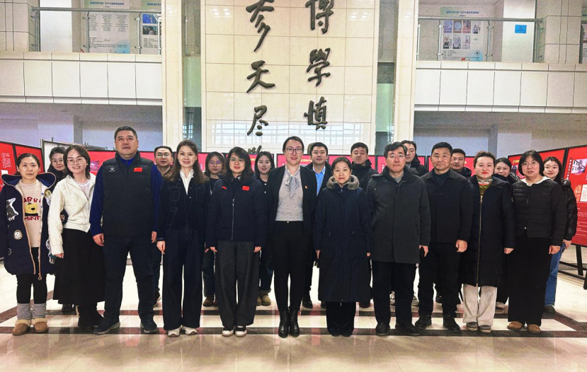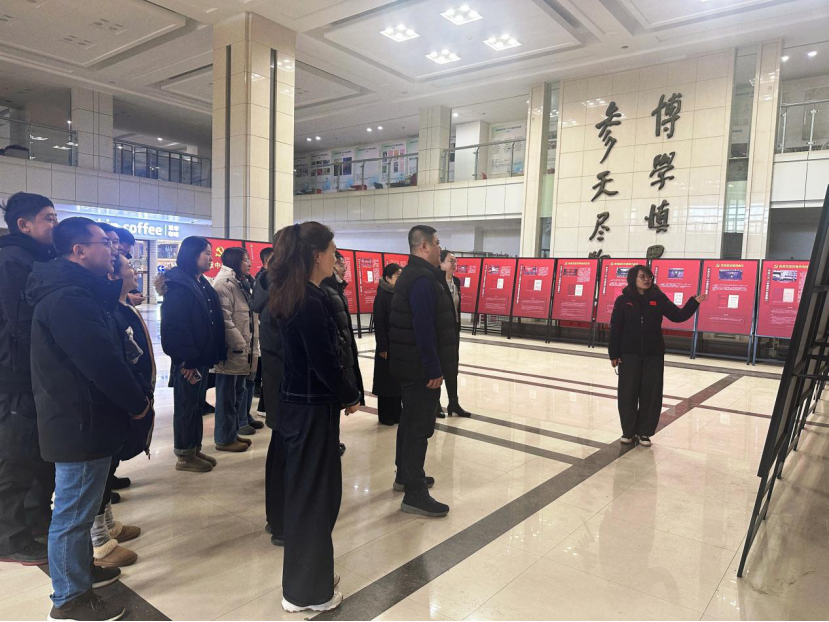 纪检委员以及教师党员在汇文楼一楼大厅参观学习“党章中的纪律”专题展览。