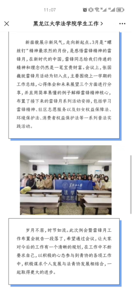 青年志愿者协会召开新学期第一次全体大会暨雷锋月工作布置会,大会由法青协主席张国巍主持。会议上,张国巍主席就雷锋月活动为切入点,主要围绕上一学期的工作总结,心得体会和未来展望三个方面进行分享,并且用简单易懂的例子解释雷锋精神核心,布置了接下来的雷锋月系列活动安排,包括学习雷锋精神、社区志愿服务以及妇女权益保障法、环境保护法、消费者权益保护法等一系列普法实践活动。