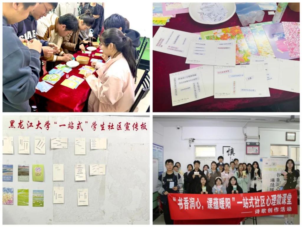 一站式社区心理微课堂—诗歌创作活动。4月22日,在黑龙江大学丽泽园10栋公寓一楼,同学们积极参与到诗歌创作活动中,通过自由组合、拼贴重构的方式,在贺卡上完成一首独具特色的拼贴诗。参与者为自己的拼贴诗命名,分享创作灵感与情感体验。创作结束后,参与者们互相分享自己的拼贴诗,感受文字的魅力。本次拼贴诗活动,不仅营造了优良的读书氛围,更向学生传达了积极思考,用心感受的好习惯,充分激发学生的创造力与想象力,促进学生间的协作与交流。