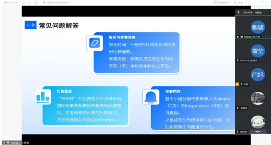 开展国际商事仲裁模拟仲裁庭辩论赛经验分享交流会,主讲人为国际商事仲裁模拟仲裁庭辩论赛团队最佳文书提名,第八届法律专业学位研究生法律文书写作大赛三等奖,“互联网+”大学生创新创业大赛省级三等奖,校三等研究生学业奖学金获得者,2024级专硕4班团支书刘毅璇。