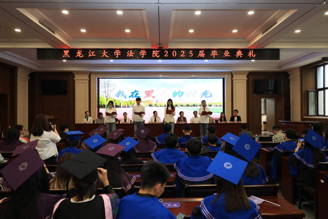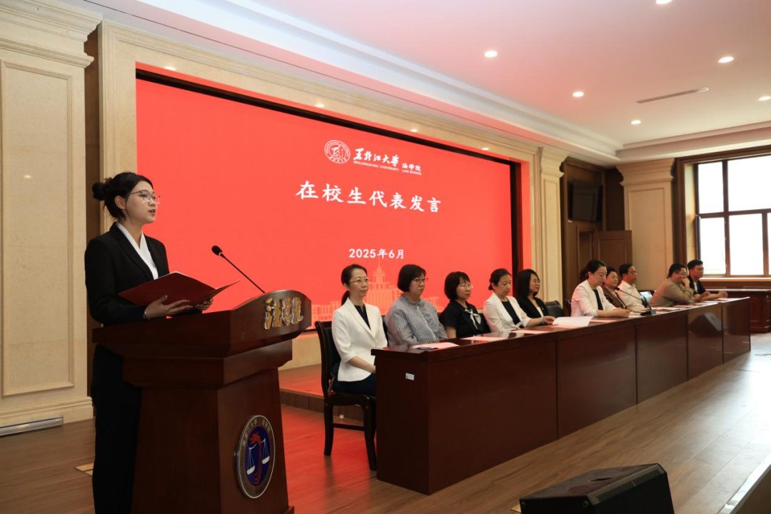 毕业生代表慕佳宝同学发言。他回顾了校园时光,感谢青春赋予的奋进力量,强调身为黑大法律人,要在时代的浪潮中勇立潮头,以实际行动讲好黑大法律人的故事,传承黑大法学精神。