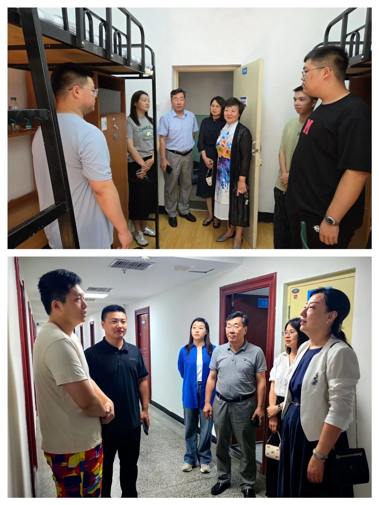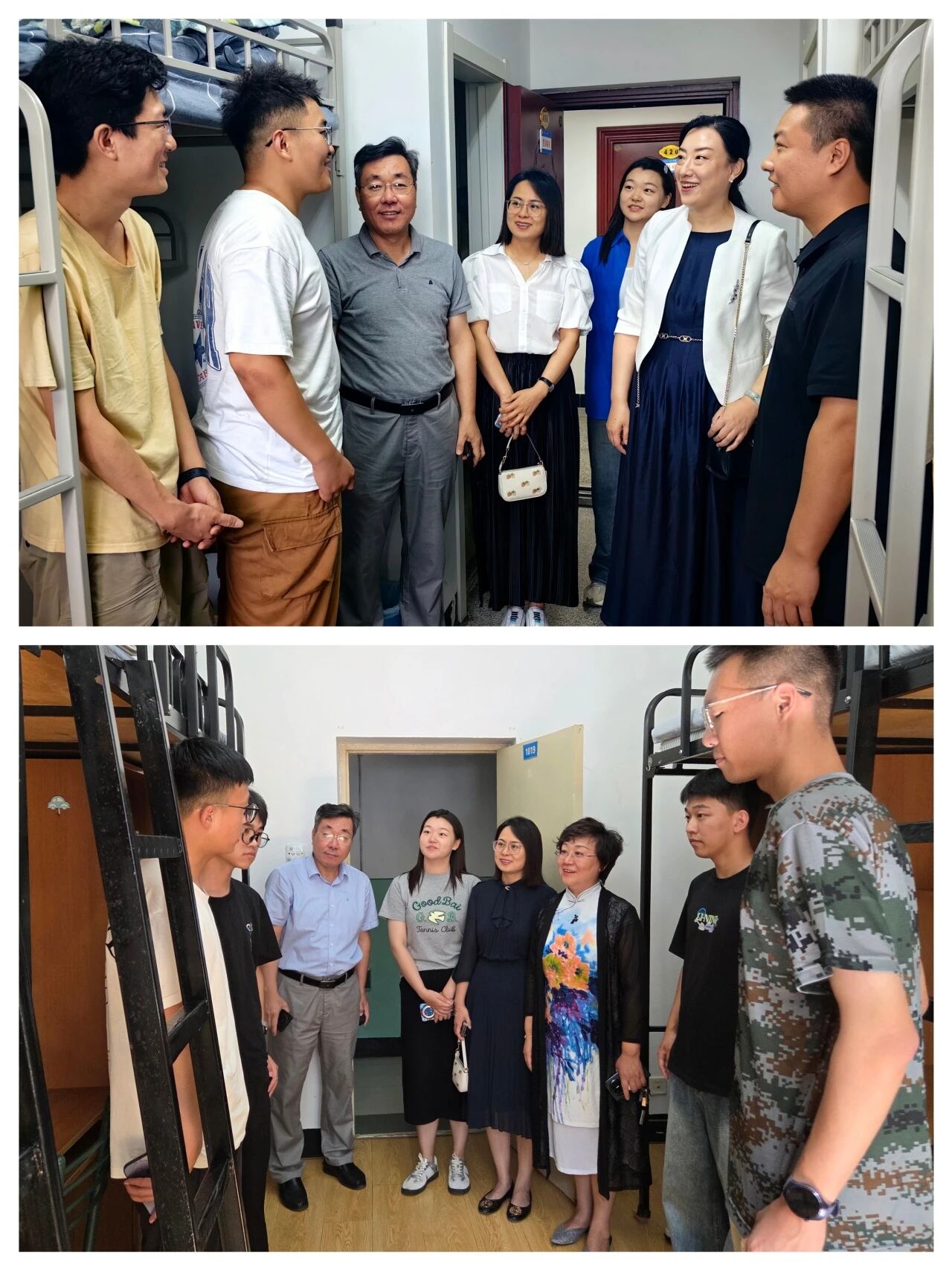 领导班子与辅导员走访新生寝室,与同学们展开亲切交流。