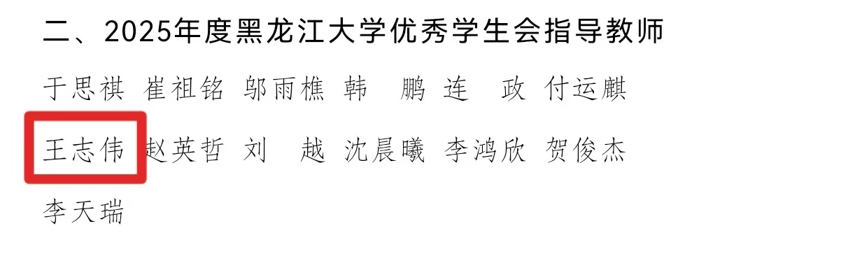 学生会指导教师王志伟获评“2025年度黑龙江大学优秀学生会指导教师”荣誉称号。