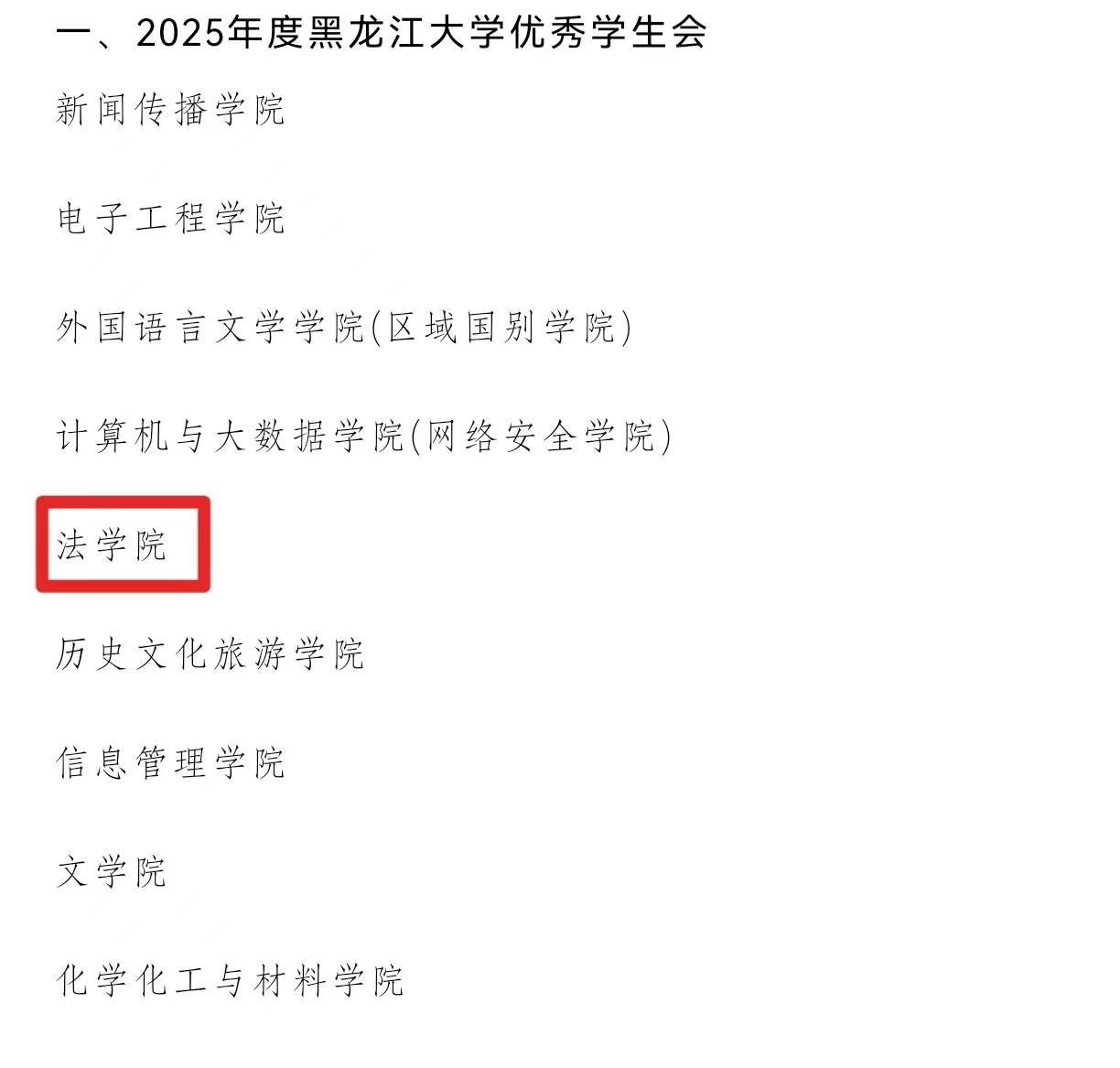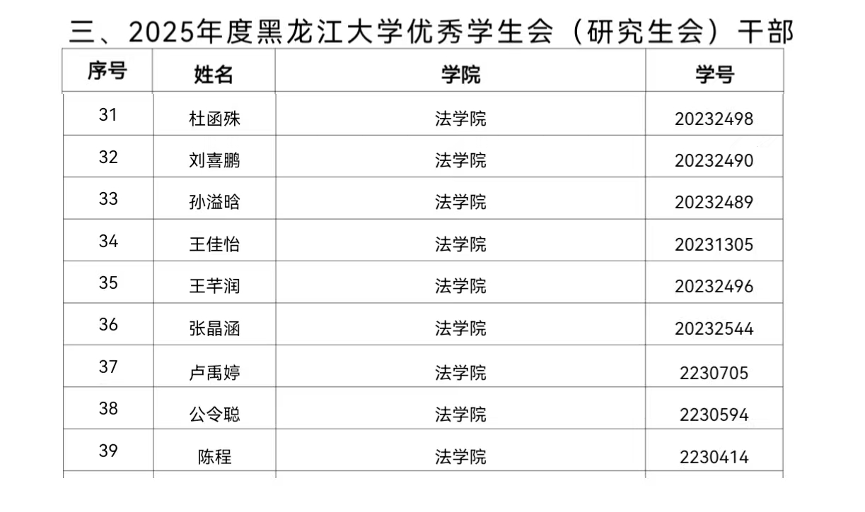 学生会杜函殊、刘喜鹏、孙溢晗、王佳怡、王芊润、张晶涵、卢禹婷、公令聪、陈程共九人获得“2025年度黑龙江大学优秀学生会(研究生会)干部”荣誉称号。