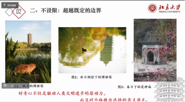 第二部分:不设限,超越既定的边界。张琨以北大不同季节的博雅塔为例,指明作为大学生不要为自己的人生设置限制,在大学生活中应该改变高中的学习模式,在课业学习的另一角度思考学习的内容。在分析问题时,不仅要多维度思考,还要在某一维度下对问题进行扩大和区分,综合多维度和不设限可以作出更适合自己的选择。同时张琨以运动作为类比,将运动与大学生活进行结合,以清华女博士龙明珠毕业选择去中学当老师为例,具体解释了如何做出不设限的选择。