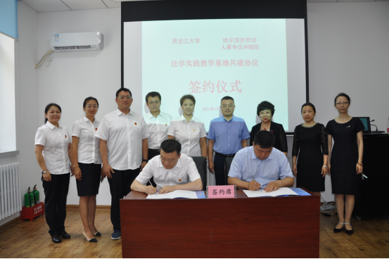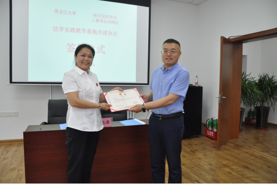 随后,哈尔滨市劳动人事争议仲裁院院长孟朝晖与黑龙江大学副校长严明签署了《法学实践教学基地共建合作协议》。