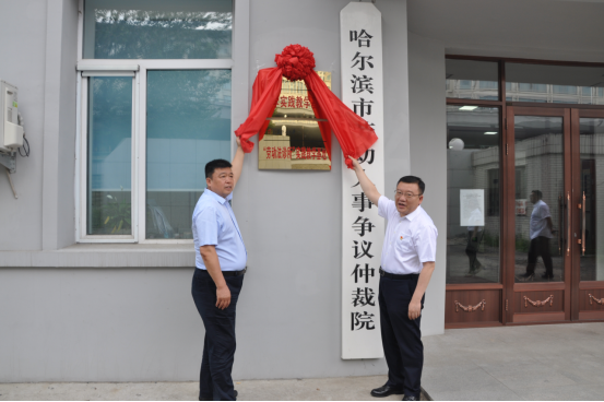 会后,哈尔滨市劳动人事争议仲裁院院长孟朝晖与黑龙江大学副校长严明共同为“黑龙江大学法学教学实践基地”及“黑龙江大学劳动法诊所实践教学基地”揭牌。