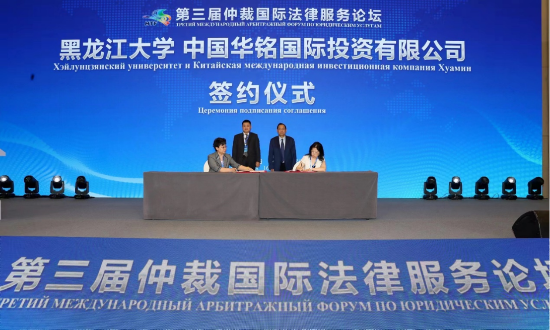论坛期间,我校与中国华铭国际投资有限公司签署战略合作协议,并且举行了黑龙江大学(海外)法学实践教学基地揭牌仪式,落地莫斯科中国贸易中心。此举将成为推动建立海外实践教学基地、加强黑龙江大学对外交流协作、有效发挥高等院校智库作用和加强仲裁队伍建设的一次具体实践;为培养具有家国情怀和国际视野、通晓国际法律规则、善于处理涉外法律事务的涉外法治人才,为仲裁法律人才培养与经济社会实践需求有机融合提供全新平台。