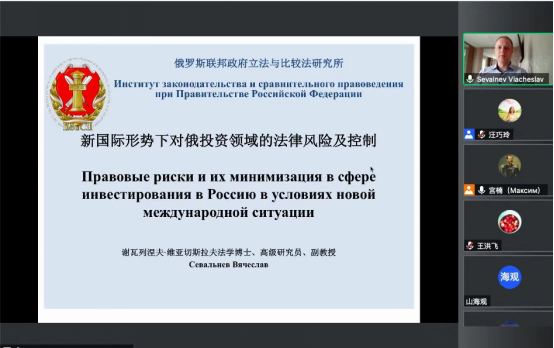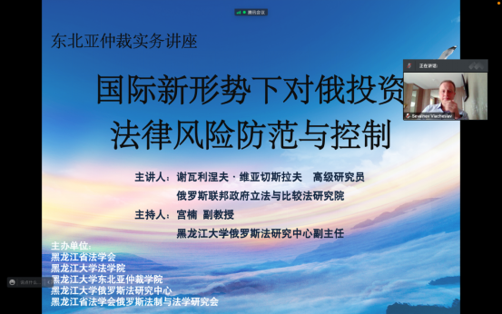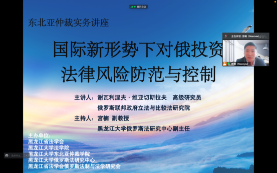 、黑龙江大学俄罗斯法研究中心、黑龙江省法学会俄罗斯法制与法学研究会共同举办了“东北亚仲裁实务”线上讲座,邀请俄罗斯联邦政府立法与比较法研究院高级研究员谢瓦利涅夫·维亚切斯拉夫作了题为“国际新形势下对俄投资法律风险防范与控制”的专题讲座。他就美欧制裁下对中国在俄罗斯境内投资的影响,以及由此可能在基础设施建设、农业、金融、资源开发、能源以及产业合作等领域引发的投资法律风险进行了分析探讨,介绍了俄罗斯政府采取的保障投资立法举措,并对中国政府和企业应当采取的应对策略提出了建议,探讨了中俄两国政府在国际新形势下稳定投资环境的国际法律合作机制。全国俄罗斯法研究专家、法律实务工作者、对俄企业法务工作者以及黑大师生共计100余人参加了本次讲座,宫楠老师为讲座提供了同传翻译。