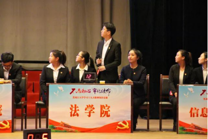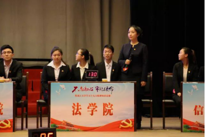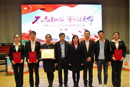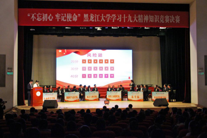 为进一步学习贯彻党的十九大精神,教育引导我校师生党员尊崇党章、遵守党规,进一步坚定理想信念,提高党性觉悟,做合格党员,2018年3月28日,黑龙江大学举办“不忘初心、牢记使命”学习十九大精神知识竞赛决赛。黑龙江大学党委书记刘德权、党委副书记蒋晶洁、党委副书记丁宏、工会主席陈德明到场观赛并为获奖单位和个人颁奖。