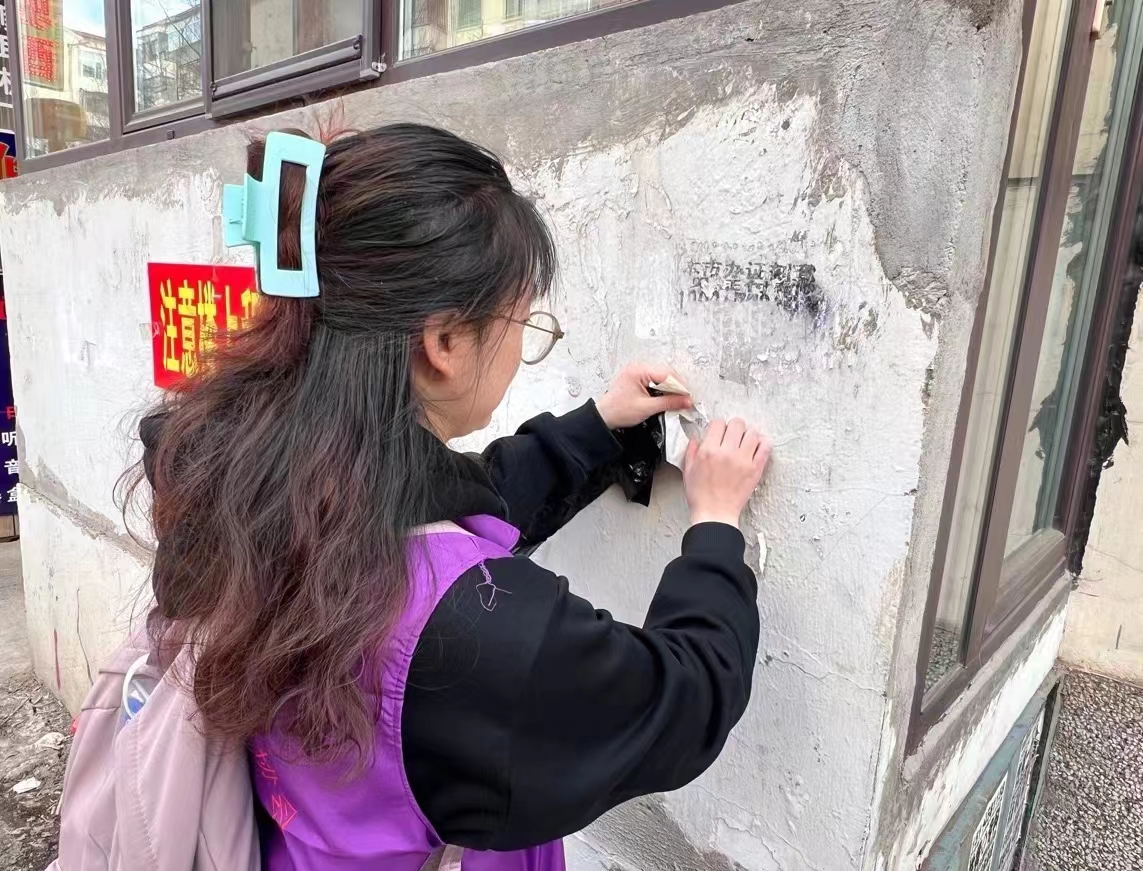 午后,志愿者们齐聚家属区,身着紫色马甲,分工明确,团结协作,有的前往楼道清理垃圾和“牛皮藓”小广告,有的用铁锹清扫落叶和杂草,有的搜寻草丛中的垃圾,展现出尊重劳动、热爱环境的精神。志愿者们用行动诠释了青年的奉献与担当,用汗水映照出青春的活力和风采,使居民们感受到了更多的关怀和温暖,得到了家属区居民的一致好评和赞扬。经过将近两个小时的努力,家属区焕发出整洁、有序的新风貌。