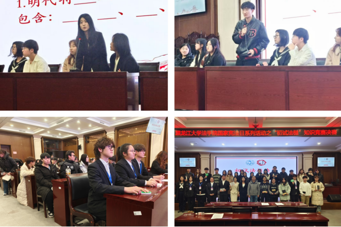 在模拟法庭举办“初试法槌”知识竞赛决赛,通过初赛笔试的六组团队以现场问答的形式,围绕宪法学、法理学、民法学和刑法学等科目的知识,进行了必答题、抢答题和风险题三个环节,经过三轮比拼,最终评选出一、二、三等奖若干名并进行表彰。本次竞赛对普法形式进行创新,以赛促学,有力推动了宪法学习的普及与深入,引导学生以实际行动弘扬宪法精神,增强法治意识。