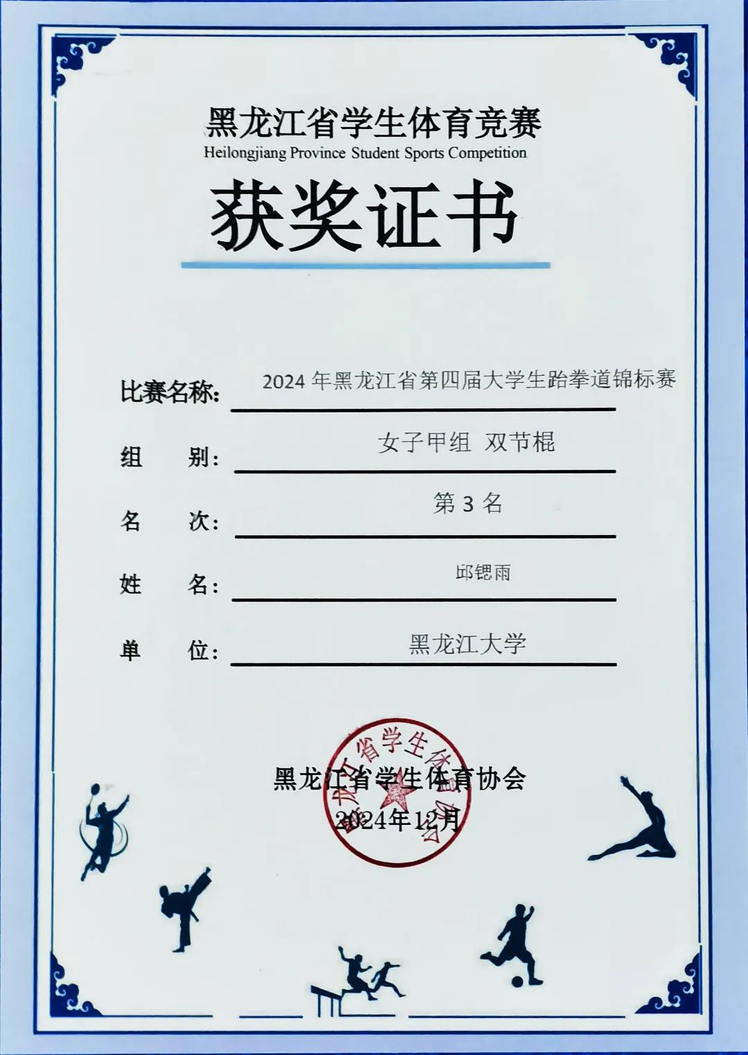 邱锶雨在获得黑龙江大学跆拳道比赛双截棍项目中脱颖而出,荣获女子组冠军,成功进入省赛。