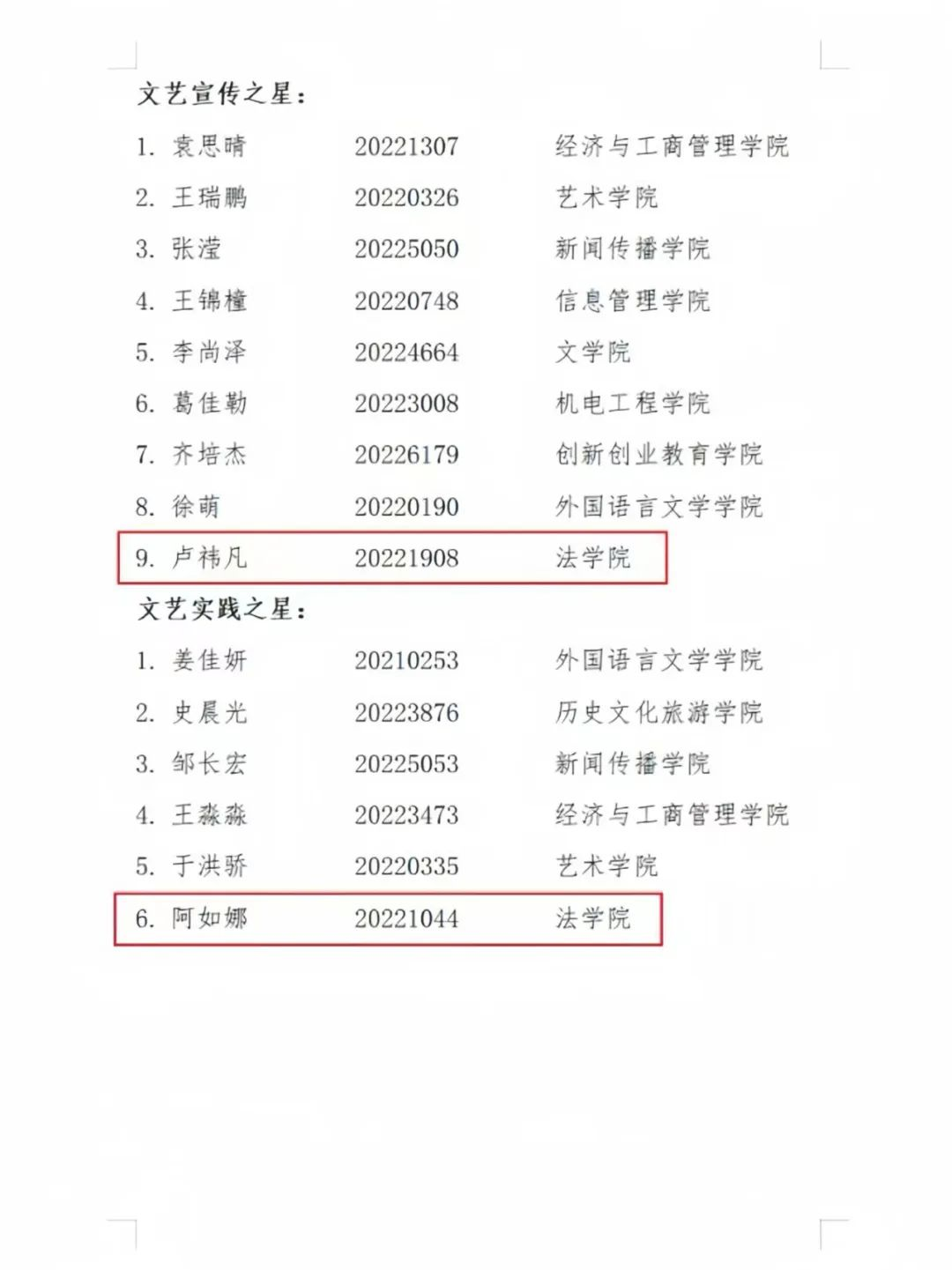 邱锶雨、范赫桐、卢祎凡、阿如娜共4名学生在校园文化活动与文艺工作方面做出突出贡献,被授予“校园文艺之星”荣誉称号。