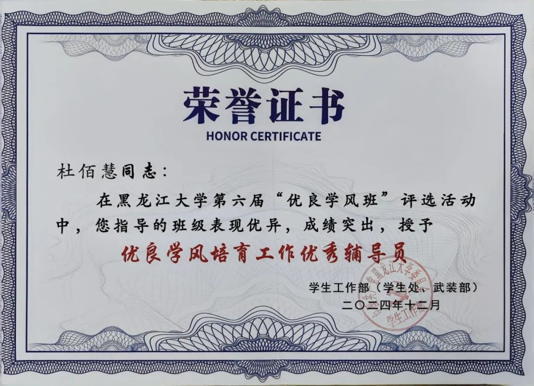 首次在实验班赛道和普通班赛道双双荣获黑龙江大学第六届“优良学风班”荣誉称号,辅导员杜佰慧被授予“优良学风培育工作优秀辅导员”荣誉称号,炸金花下载