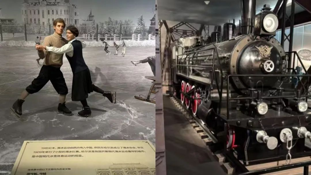 再往里走,入目的是带着古朴气息的火车头,展品展现了20世纪初哈埠的社会生活展,再现了当年哈尔滨艰苦卓绝的历史年轮。馆内存留的许多蜡像,更为我们介绍了哈尔滨的运动形式,滑冰由西方传入我国,哈尔滨也是我国最早开展现代滑冰运动的城市,是中国现代冰雪体育运动的摇篮。
