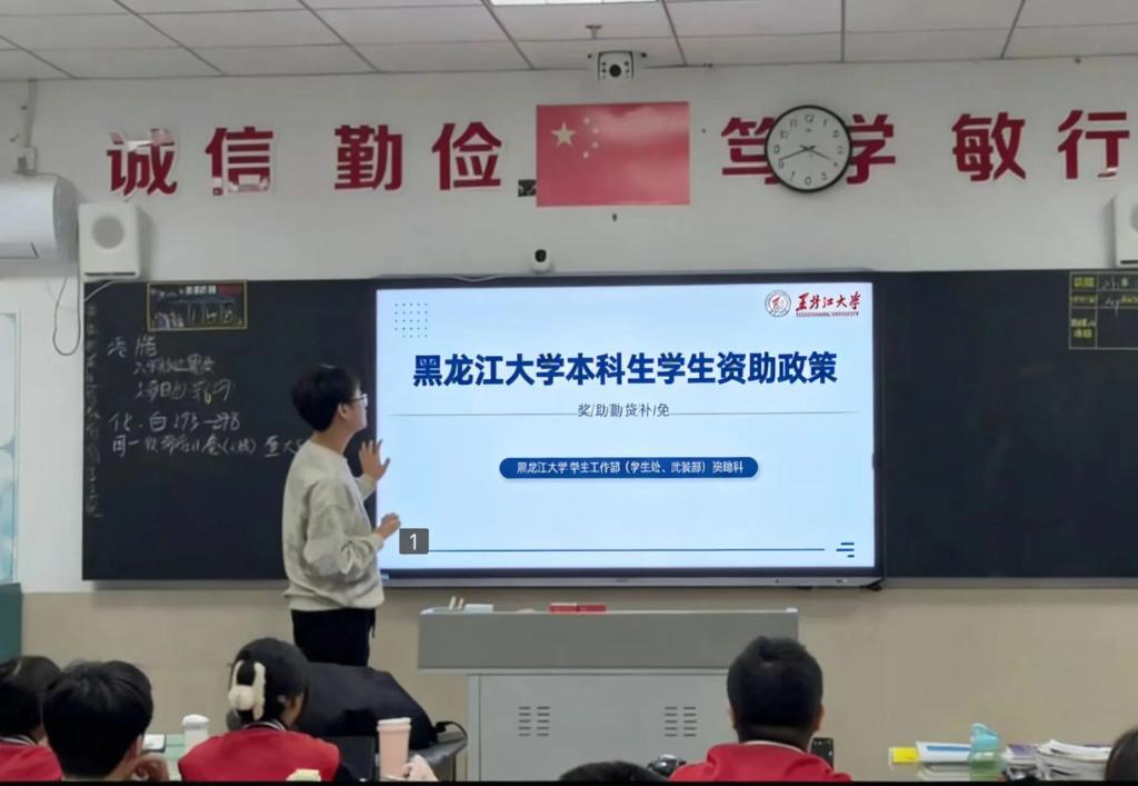 1月7日,资助政策宣传志愿服务队走进渤海中学开展高校资助政策专题宣讲活动。活动中,志愿者巩延香围绕国家及学校“奖、助、贷、勤、补、免、绿色通道”七位一体资助体系,详细讲解各项资助政策的申请流程、审核标准与帮扶力度,并结合真实案例答疑解惑、回应关切。宣讲用通俗易懂的语言普及资助政策,有效消除了学生及家长的升学顾虑,坚定了备考学子的升学信心,充分展现了黑龙江大学资助育人的责任担当与人文温度。
