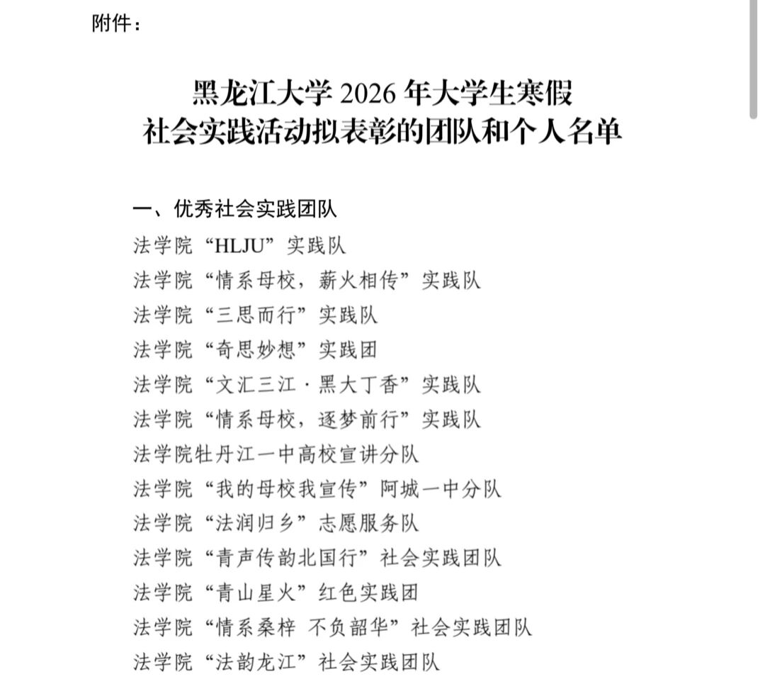 “HLJU”实践队、“情系母校,薪火相传”实践队、“三思而行”实践队、“奇思妙想”实践团、“文汇三江·黑大丁香”实践队、“情系母校,逐梦前行”实践队、牡丹江一中高校宣讲分队、“我的母校我宣传”阿城一中分队、“法润归乡”志愿服务队、“青声传韵北国行”社会实践团队、“青山星火”红色实践团、“情系桑梓 不负韶华”社会实践团队、“法韵龙江”社会实践团队共13个团队表现优异,荣获“黑龙江大学2026年寒假社会实践活动优秀实践团队”荣誉称号。